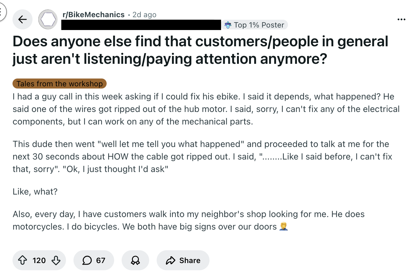 I read r/bikemechanics to stay close to what's happening on shop floors and what customers are actually experiencing. The community is candid, often funny, and full of real signal. Go spend an hour there. You'll learn something.